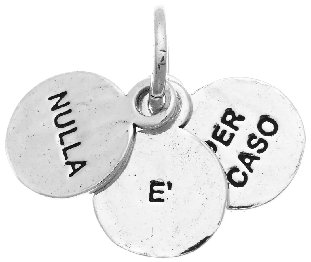 E´ un simpatico charm formato da tre medagliette che riportano la scritta "Nulla è per caso". Le monetine hanno un diametro di cm. 1.2. collegate con la maglia rotonda con logo Raspini di cm. 0.9
