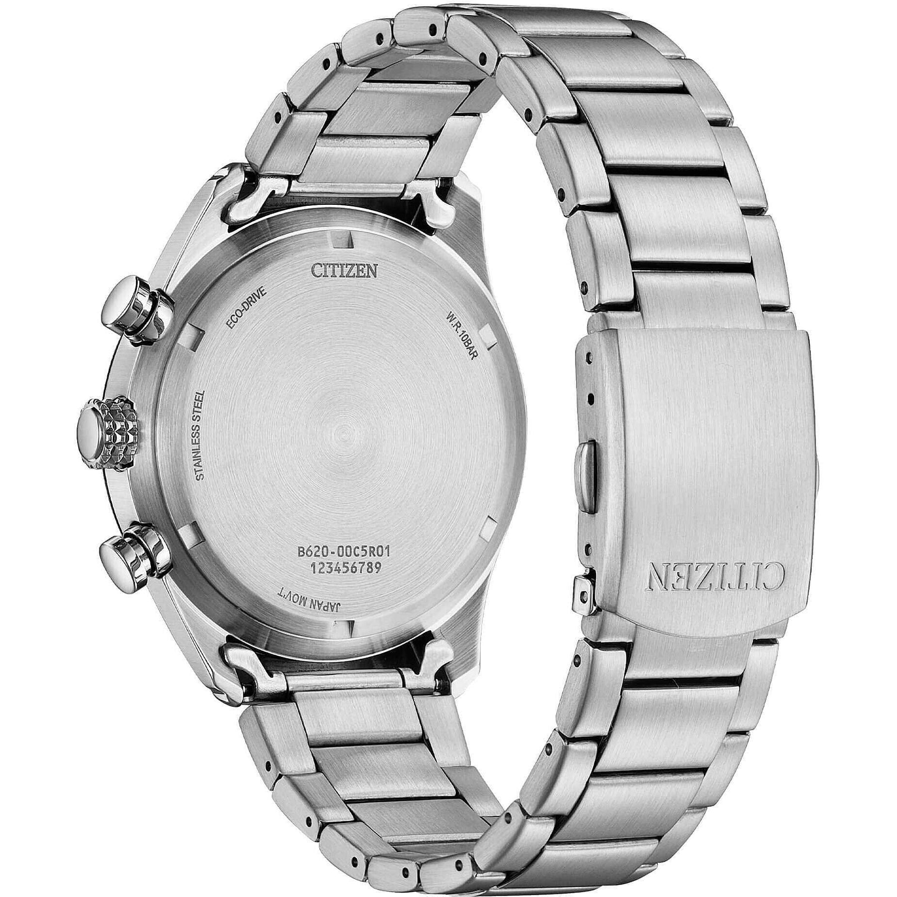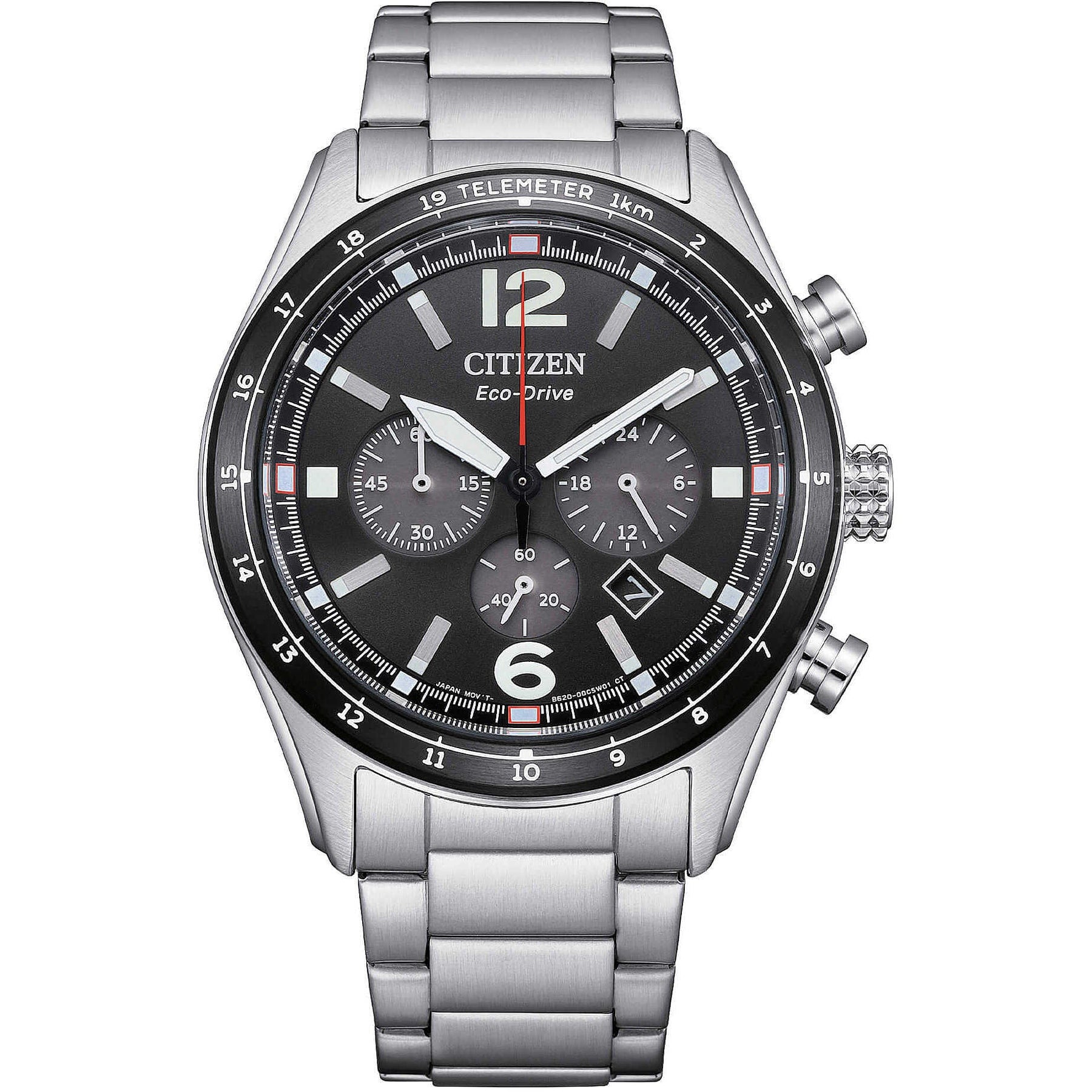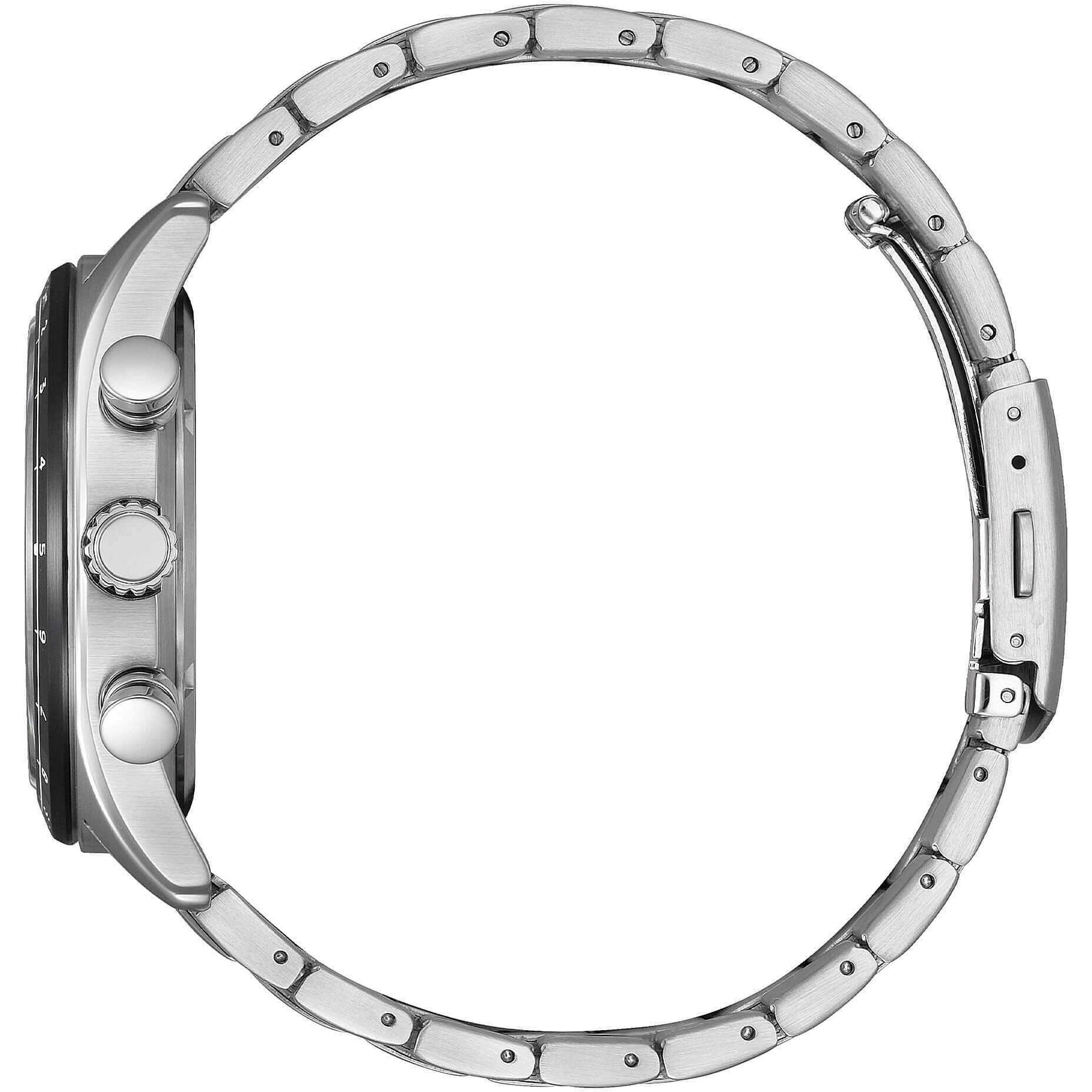 Orologio da uomo del brand Citizen della collezione Aviator. Orologio cronografo con cassa in acciaio con fondo serrato a vite diametro cassa 43 mm e vetro minerale. Quadrante nero con indici applicati e ghiera nera e bracciale in acciaio con chiusura a pulsante. Movimento eco drive con riserva di carica di 7 mesi cal b620, resistenza all'acqua: 10 ATM. Datario: sì.