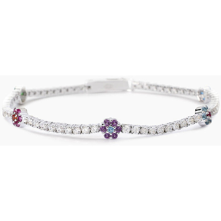 Bracciale da donna di Mabina Gioielli della collezione Fior Fiore. Bracciale tennis in argento 925 rodiato con elementi fiore 5,5x5,5 mm con zirconi colorfull di diametro pari a 1,75 mm e bianchi di diametro pari a 2 mm, lunghezza 16 cm. La referenza è: 533885-16