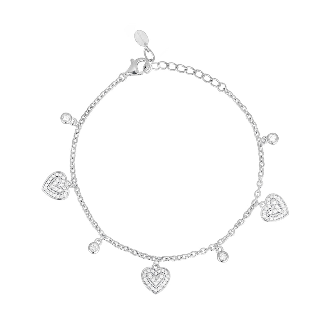Bracciale in argento con cuori in pavé di zirconi alternati a punti luce in zircone.