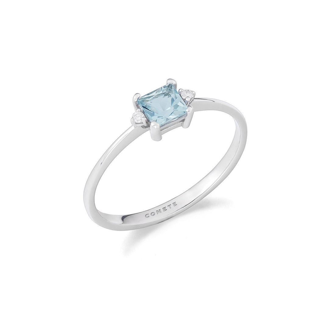 Anello da donna di Comete in Oro bianco 18k. Diamanti P.Ct. 2 Colore G Purezza SI. Acquamarina carrè 4x4 Ct.0,30 della collezione storia di luce colore. Misure del gioiello: larghezza centrale 4,72 mm, lunghezza centrale 6,97 mm, profondità centrale 3,33 mm.