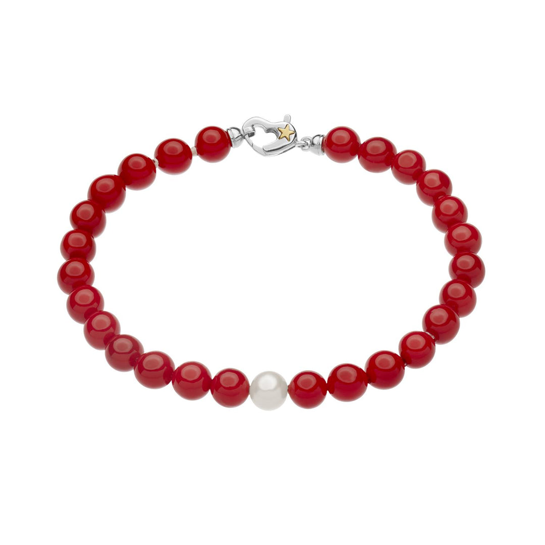 Bracciale da donna di Comete della collezione di fili primavera. Gioiello realizzato con chiusura in cuore in argento 925‰ e stella in oro 750‰. Shell pearl corallo ø6/6,5 e perla coltivata bianca ø 6/6,5. Lunghezza 18 / 18. 5 cm circa.